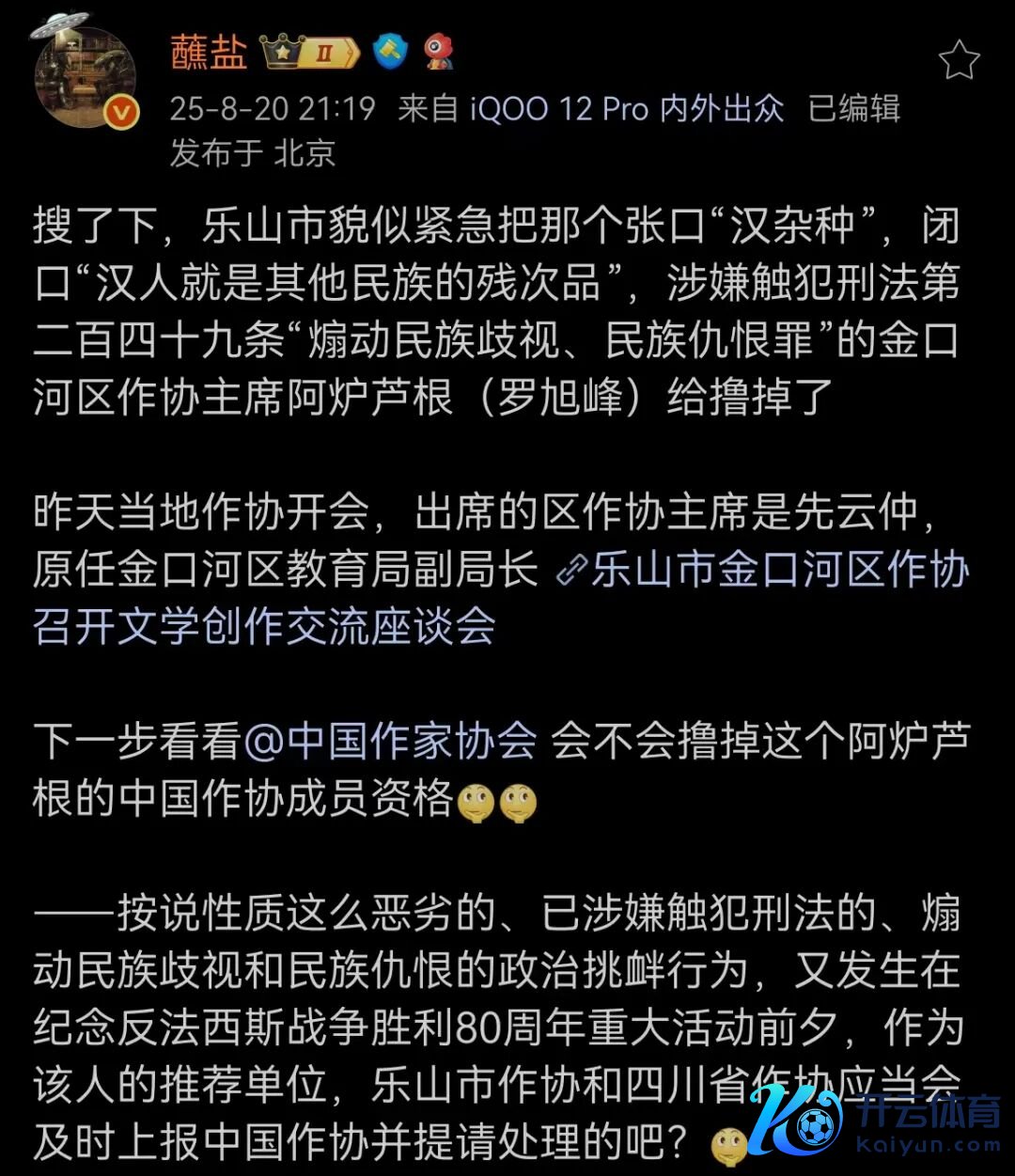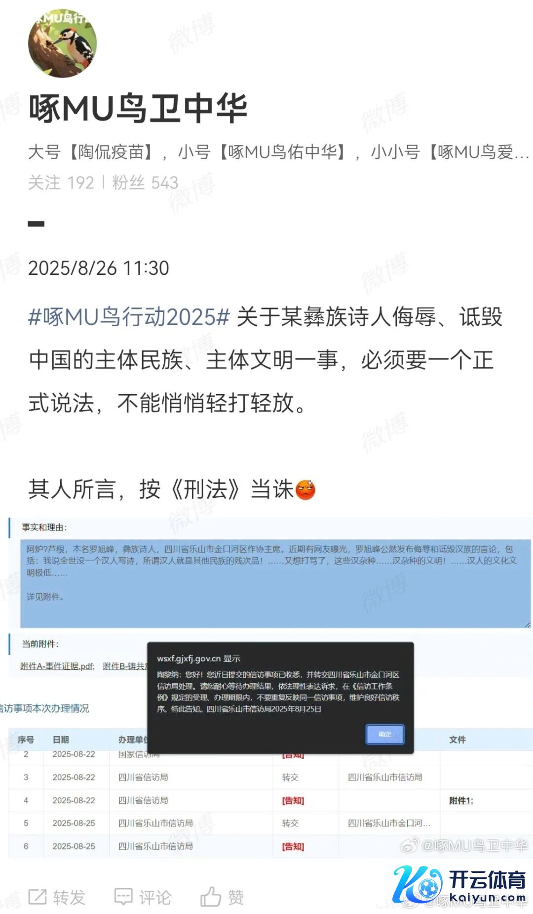 上月,有一位Yi族诗东说念主罗某峰,省作协委员,某地区作协主席,公然发表侮辱汉族的言论。 其辱汉言论曝光后,网友群情激奋。有驻守网友发现,当地 之后 举办的作协会议上, 罗某峰还是散失。 关联词,官方于今皆未昭示对罗某峰的任那边理决定。若是只是偷偷处理了,齐全无法起到警示作用,也无法服众。 是以,陶大夫决定用我最擅长的样貌,提取一个官方回话。2025年8月21日,我在国度投诉平台提交投诉,主要诉求: 四川省乐山市罗某峰公然虚构、侮辱、腻烦汉族,严重龙套民族相助,严重毁伤中华英才共同体意志,触犯