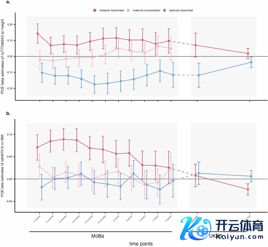 限制发现,那些影响成东谈主身高的遗传变异(如rs77708343和rs576603),在儿童阶段就也曾自满出权贵的POE,且效应地方与成年期一致,说明亲原本源效应从早期孕育阶段就运转捏续阐述作用。