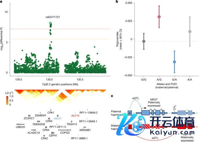 在7号染色体上一个已知的印章区域,变异rs62471721对甘油三酯弘扬出彰着的双极效应:当来自父亲时,它会裁汰甘油三酯水平;而当来自母亲时,却进步甘油三酯水平。